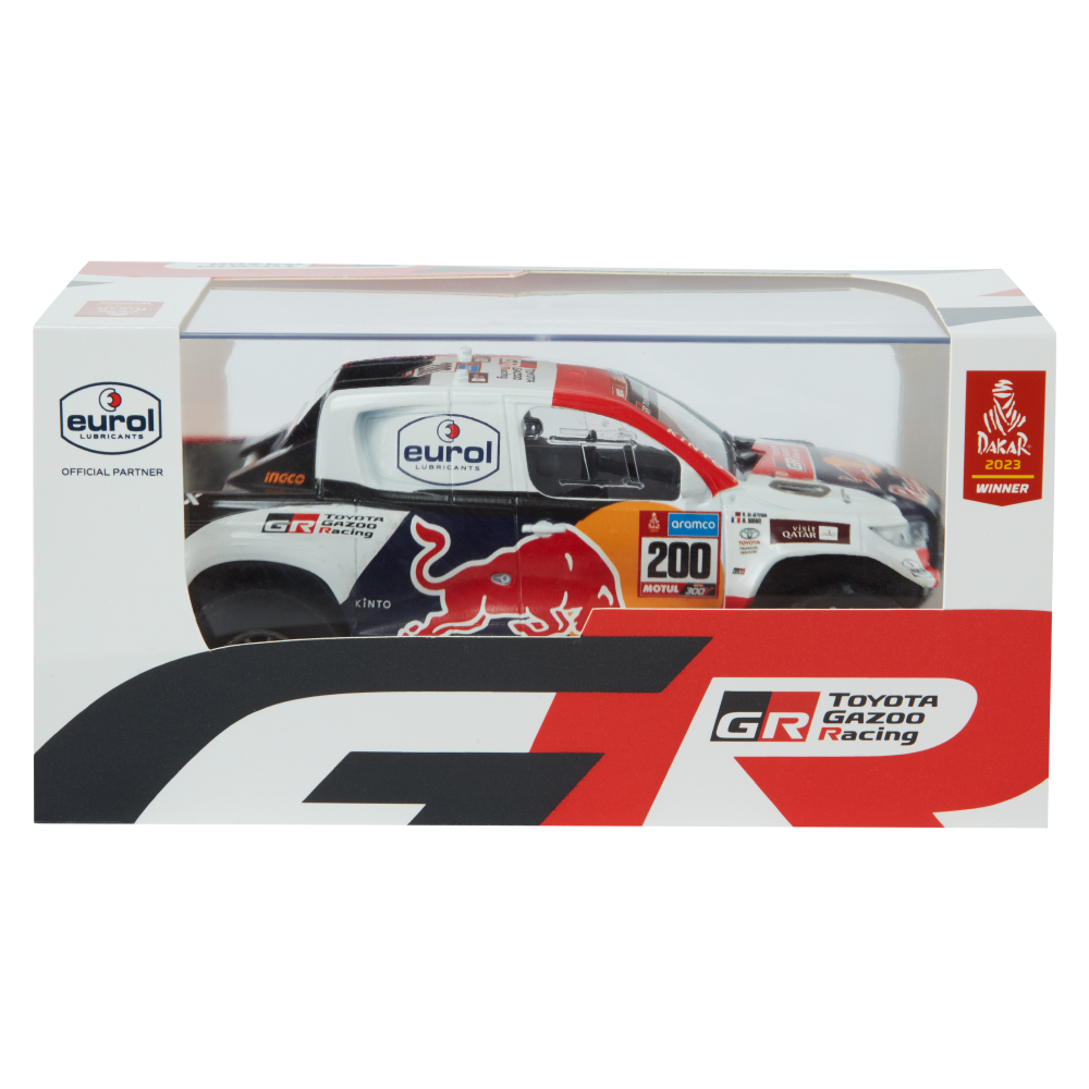A 1-24 scale replica model of the winning GR DKR Hilux T1+ rally car from the 2023 W2RC DAKAR Rally driven by Nasser Al-Attiyah and co-driver, Mathieu Baumel. Individually finished and mounted with drivers name printed; presented in a branded box. A true collector's model which includes all the finer details of the TOYOTA GR DKR Hilux T1+ rally car to create a truly specialist collector’s item.