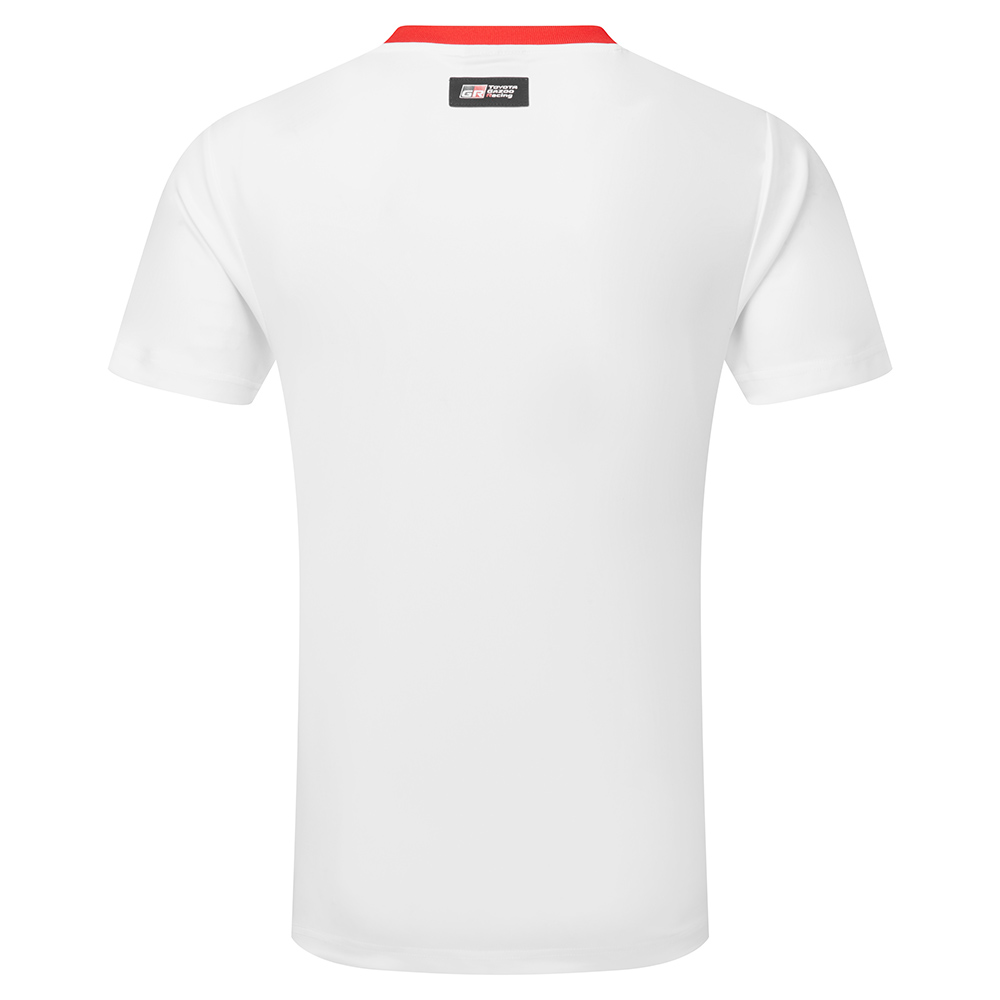 The TOYOTA GR men's white technical t-shirt is engineered from a high-quality polyester fabric to cater for an active lifestyle. This breathable, quick-drying and high wicking fabric is designed to keep you cool and comfortable when you need it most. Distinguished by contrasting ribbed collar and branded tape adorning the left shoulder for a unique aesthetic touch. Finished with a rubberised GR logo to the front and the TGR logo subtly positioned on the back, ensuring the wearer a blend of style and performance.
