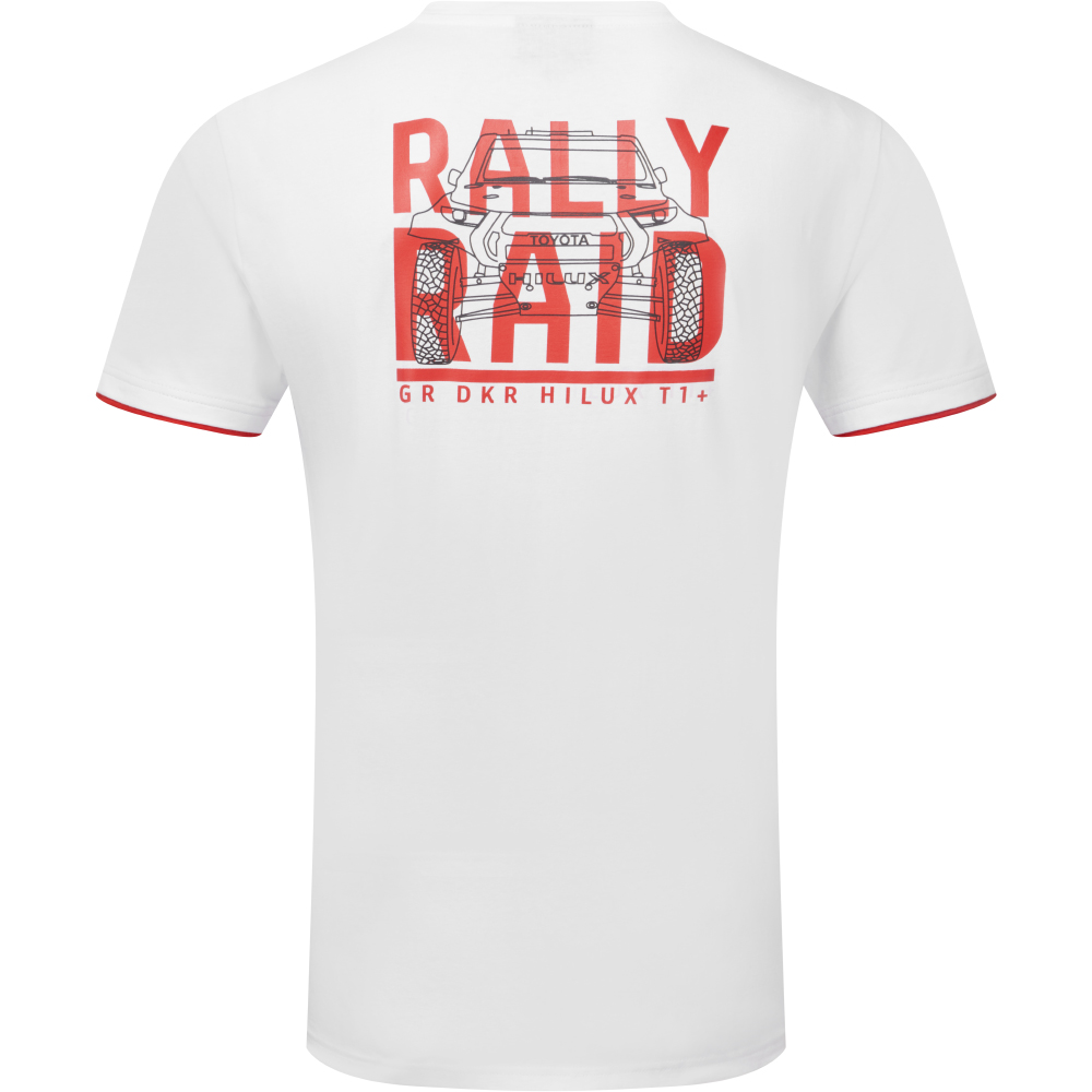 The TOYOTA GAZOO Racing Rally Raid white t-shirt is not just sportswear, but a symbol of team support. With a distinctive red GR DKR Hilux Evo T1U graphic on the back and the team logo, it's authentically unique. The design merges style and sportiness with contrasting double-layered cuffs.